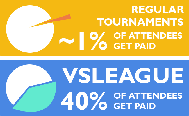 Contrairement au format tournoi qui nécessite beaucoup d'organisation pour un événement limité dans le temps, VSleague propose avec son championnat un format constamment en évolution, et ce tout au long de l'année.